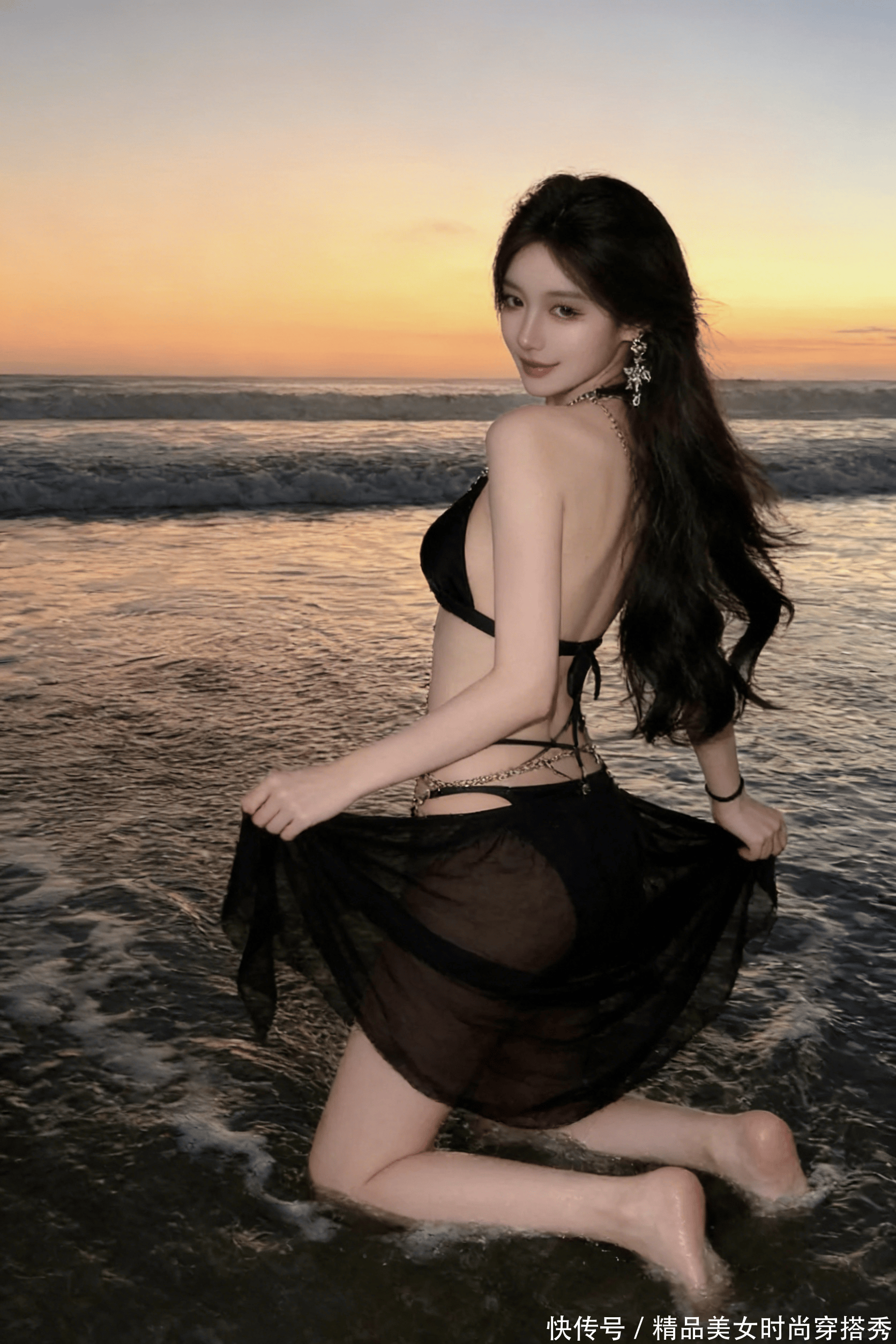 当落日把最后一抹金辉泼在海面,当浪涛一遍遍温柔吻过沙滩,她就这么跪在浅浪里,直接把 “风情” 刻进了每一缕海风里。